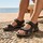 Overdelen er fremstillet i kvalitets nubucklæder, som både er slidstærkt og behageligt mod foden. De tre justerbare velcroremme gør det nemt at tilpasse sandalen, så du får en optimal og stabil pasform hele dagen.